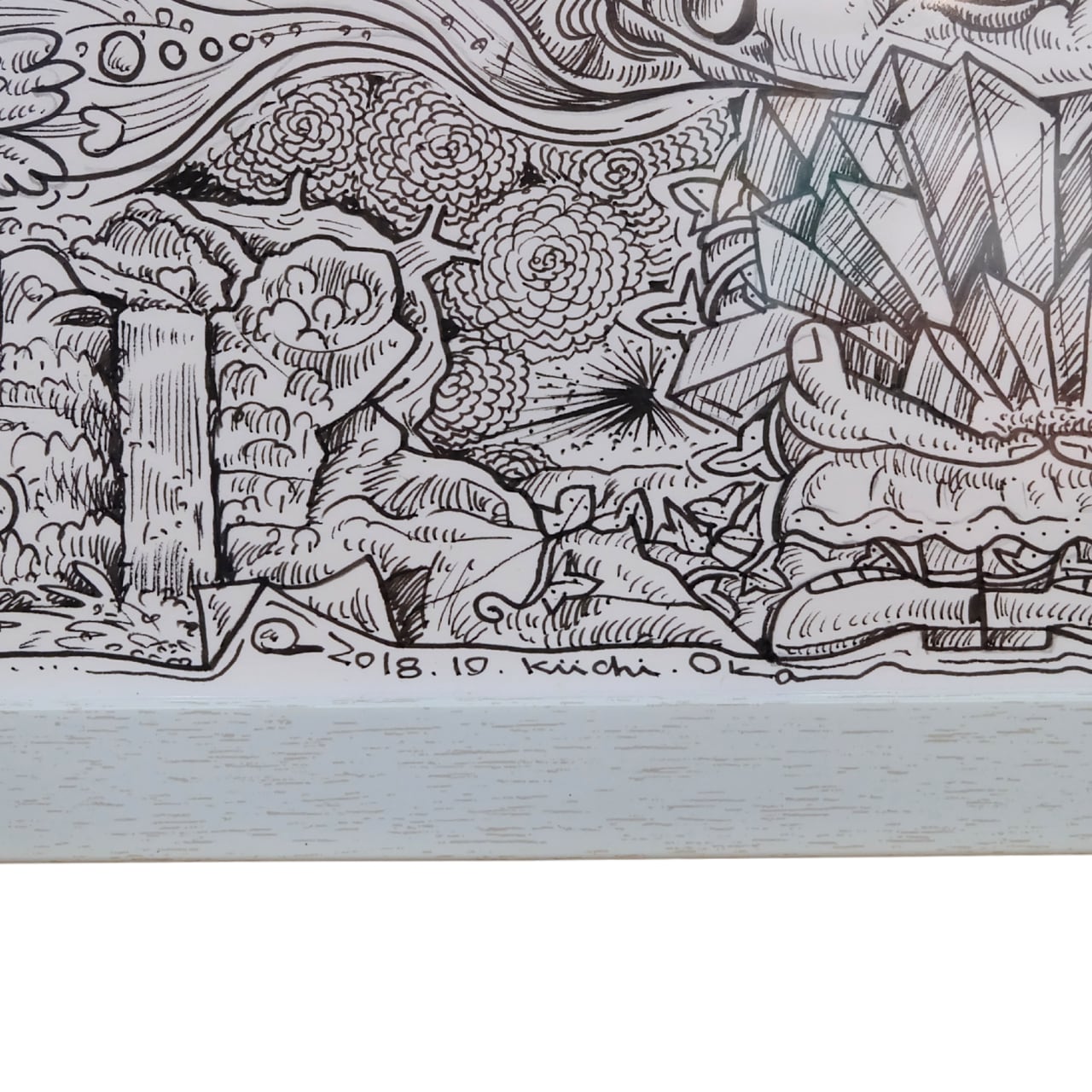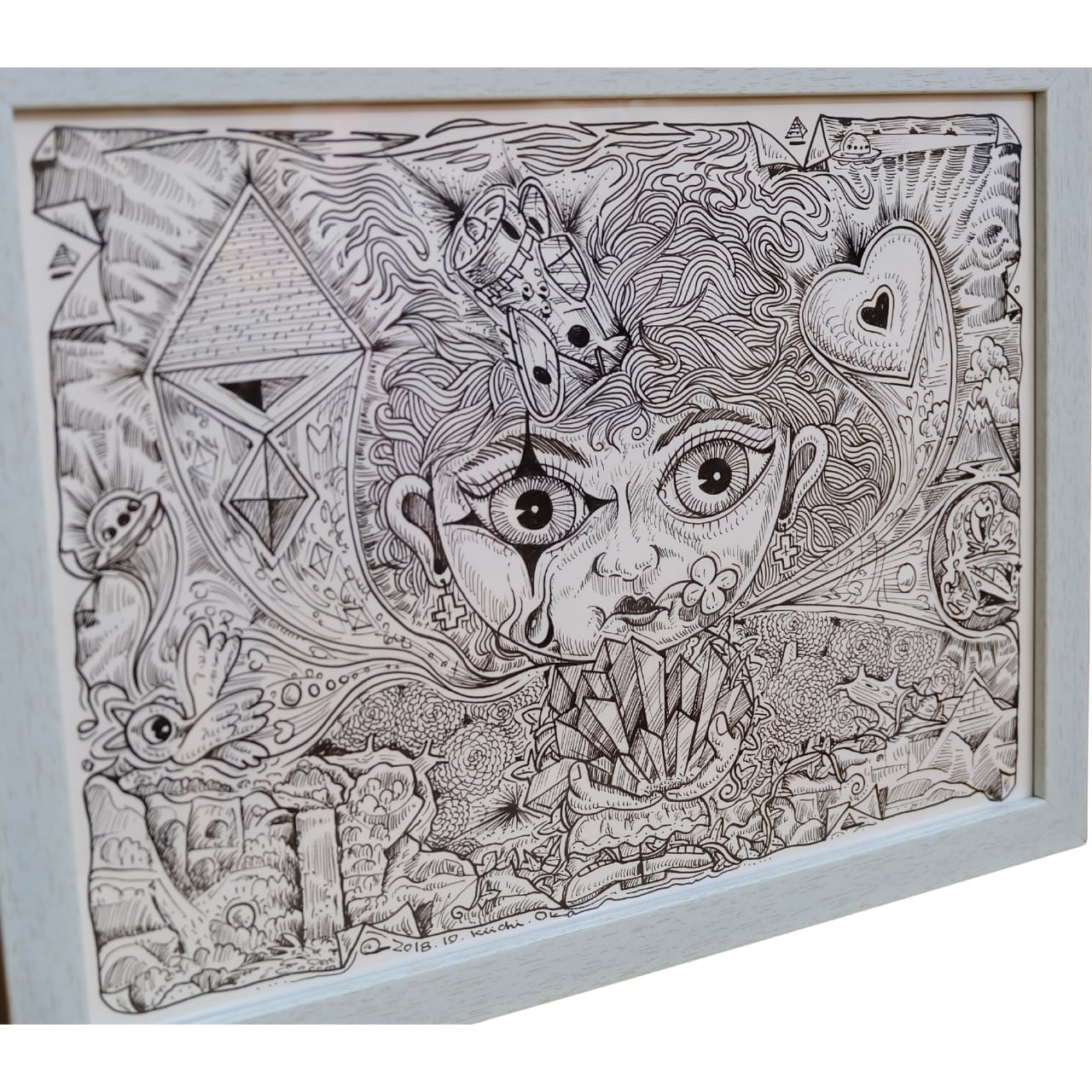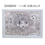 本作は、岡喜一氏が手がける連作「100点ペン画」のうちの一点です。 全ての作品に『記憶』というタイトルが冠されており、作家の脳内に広がる膨大なイメージの断片が、緻密なペンタッチによって一枚ずつ丁寧に描き出されています。 額縁にはシリーズの通し番号が振られた、世界に唯一の貴重なナンバリング作品です。
