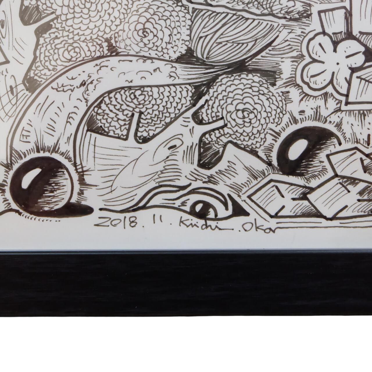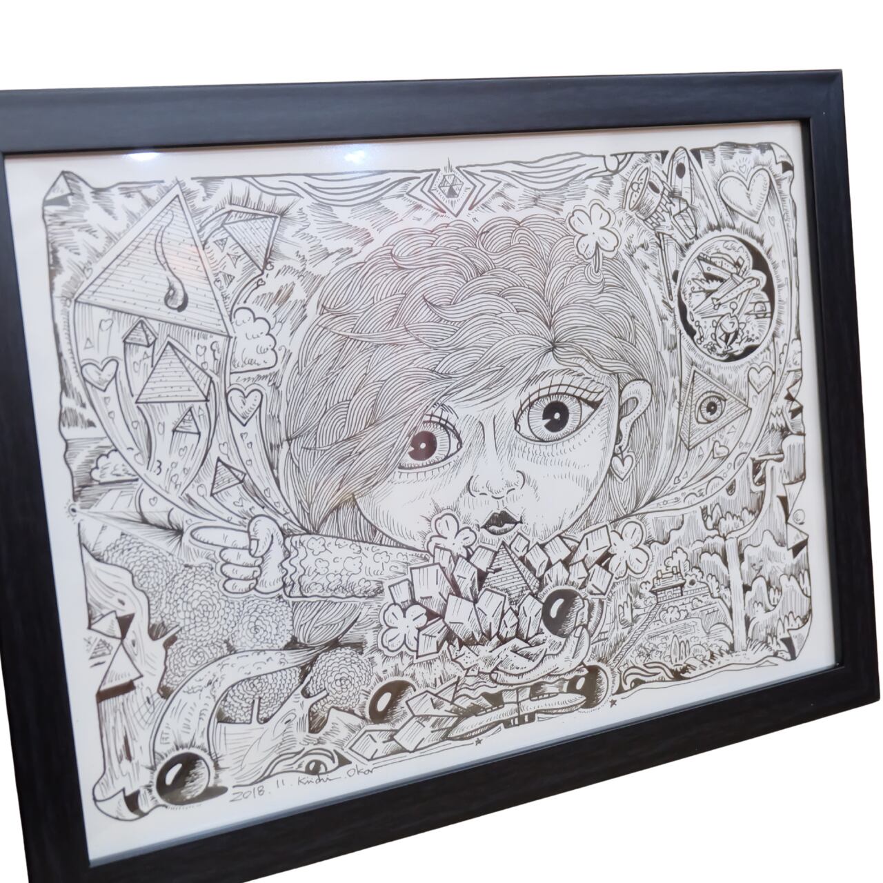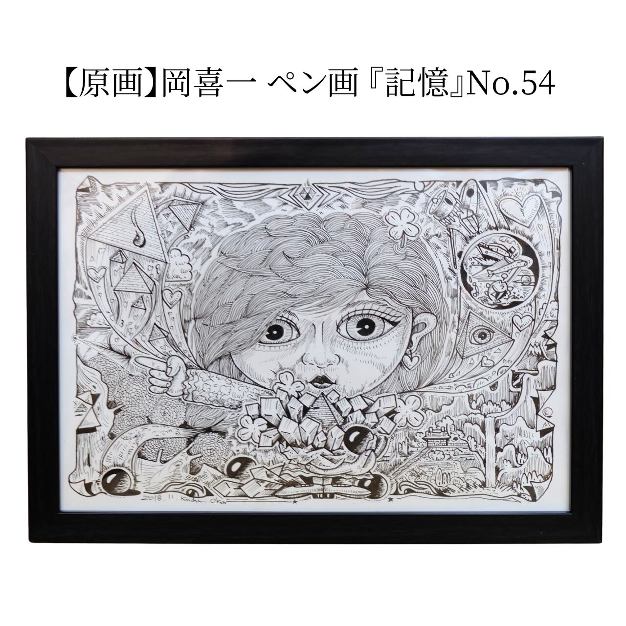 本作は、岡喜一氏が手がける連作「100点ペン画」のうちの一点です。 全ての作品に『記憶』というタイトルが冠されており、作家の脳内に広がる膨大なイメージの断片が、緻密なペンタッチによって一枚ずつ丁寧に描き出されています。 額縁にはシリーズの通し番号が振られた、世界に唯一の貴重なナンバリング作品です。