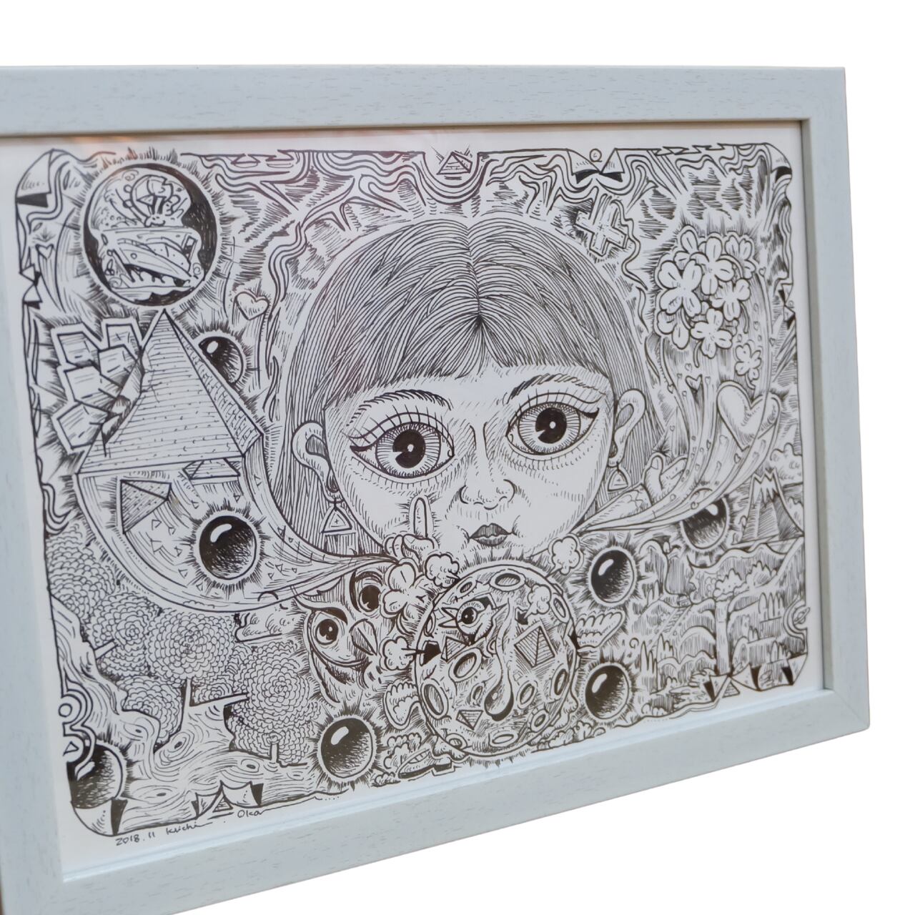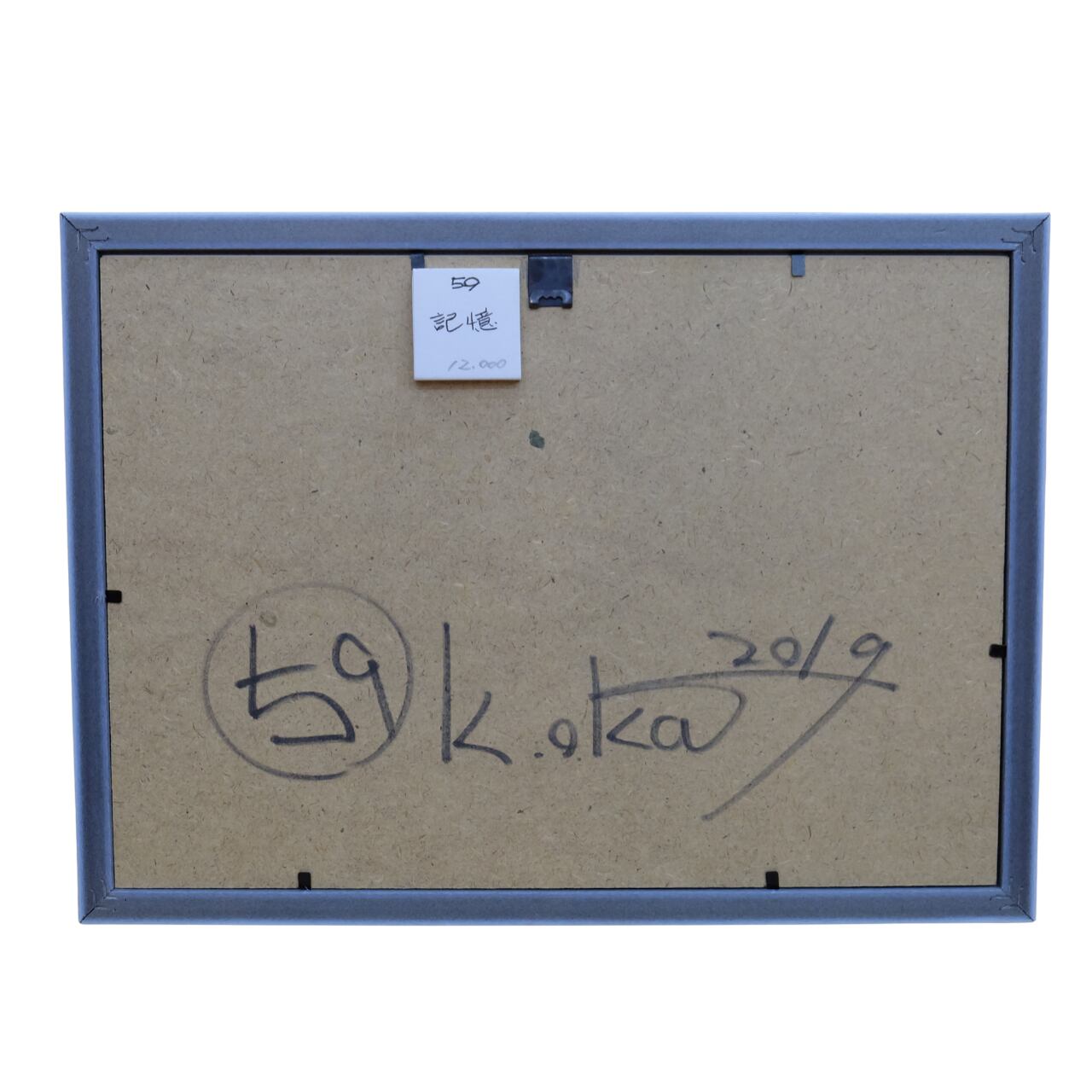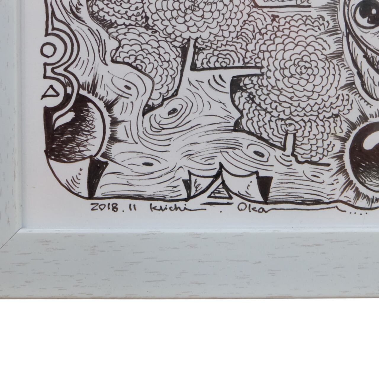 本作は、岡喜一氏が手がける連作「100点ペン画」のうちの一点です。 全ての作品に『記憶』というタイトルが冠されており、作家の脳内に広がる膨大なイメージの断片が、緻密なペンタッチによって一枚ずつ丁寧に描き出されています。 額縁にはシリーズの通し番号が振られた、世界に唯一の貴重なナンバリング作品です。