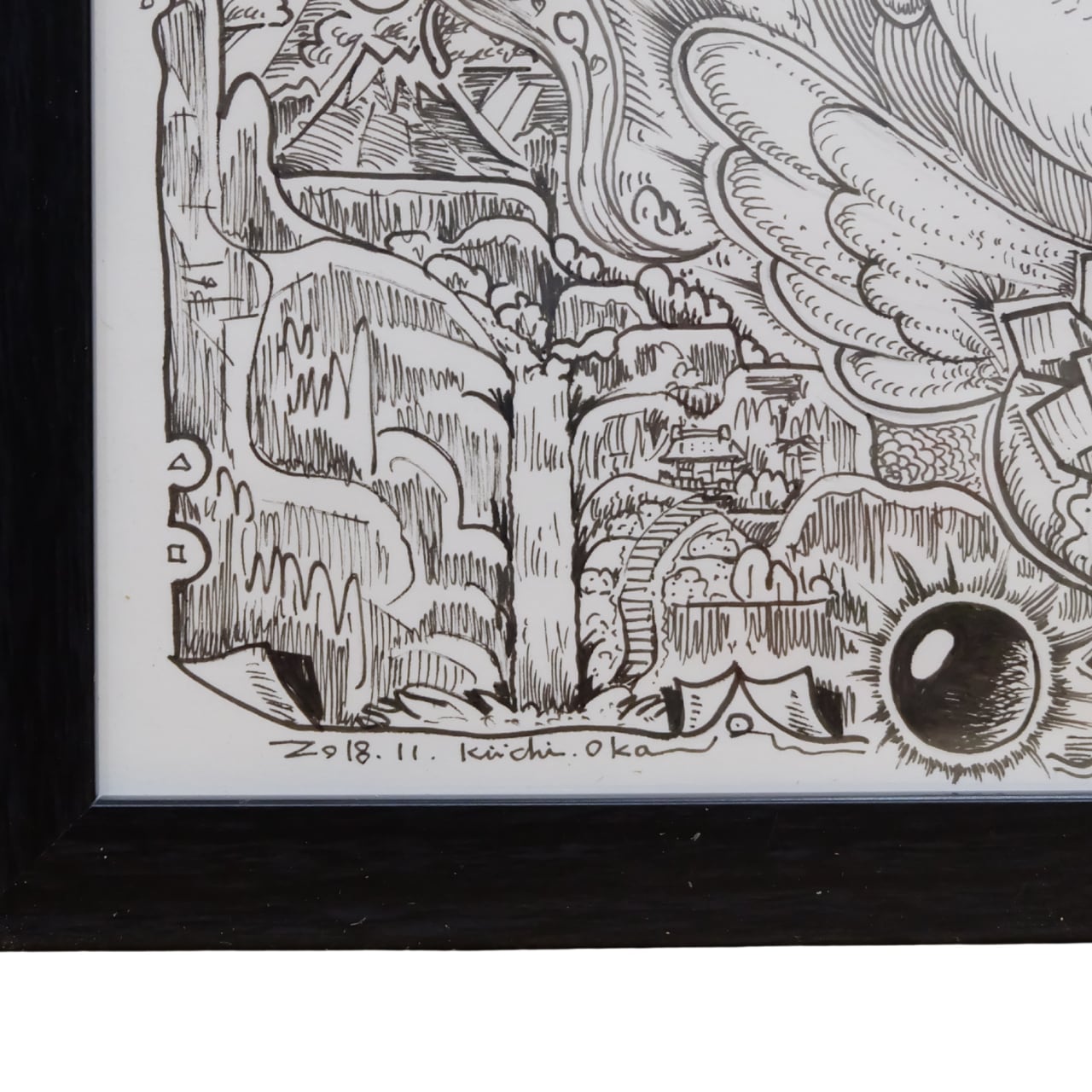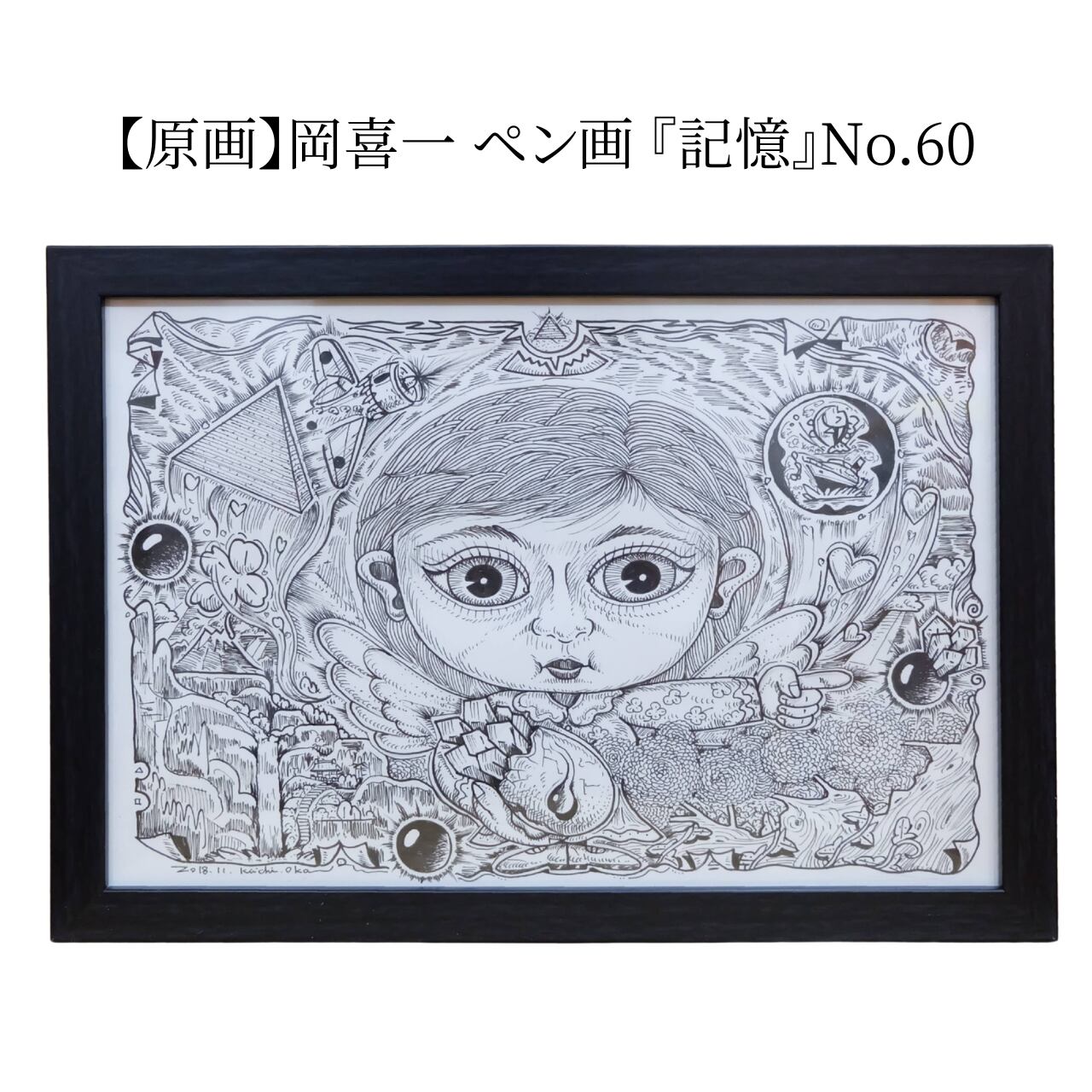 本作は、岡喜一氏が手がける連作「100点ペン画」のうちの一点です。 全ての作品に『記憶』というタイトルが冠されており、作家の脳内に広がる膨大なイメージの断片が、緻密なペンタッチによって一枚ずつ丁寧に描き出されています。 額縁にはシリーズの通し番号が振られた、世界に唯一の貴重なナンバリング作品です。