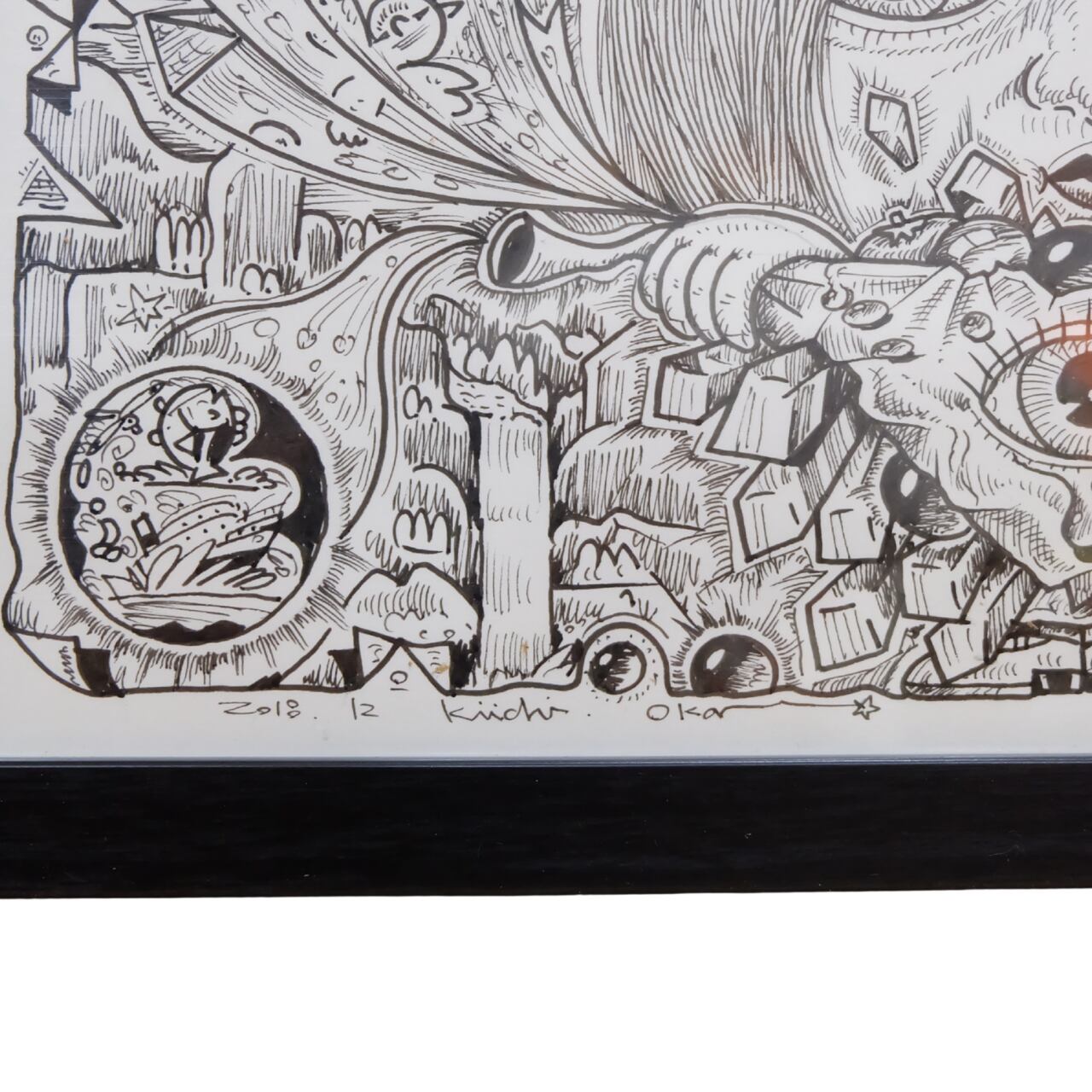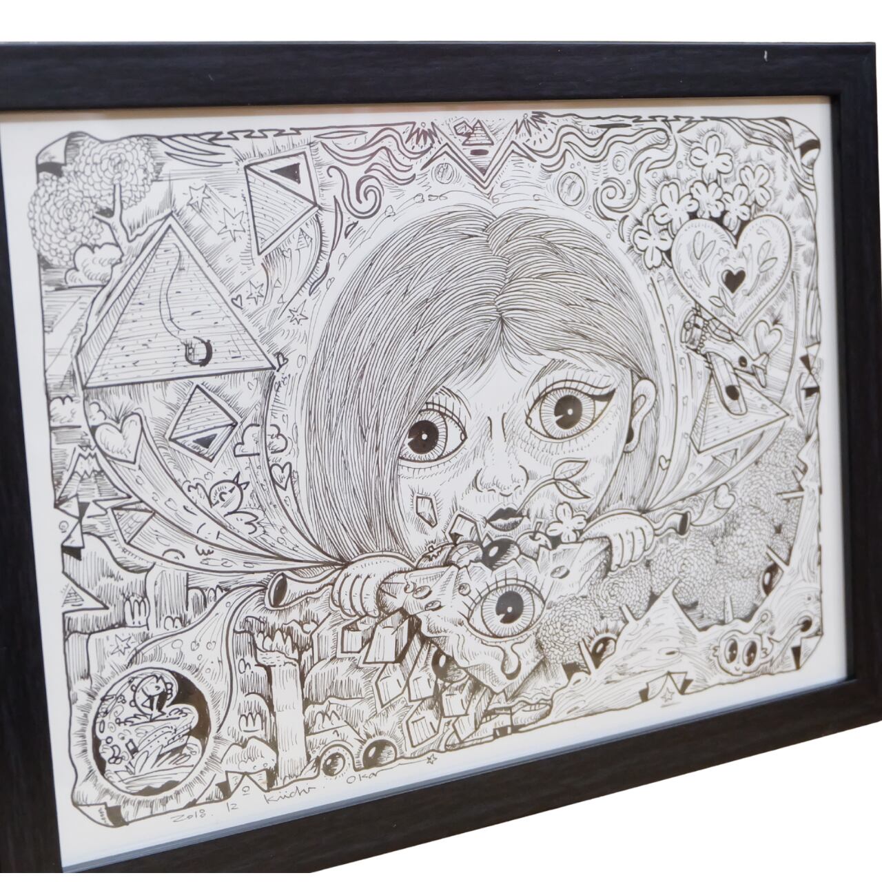 本作は、岡喜一氏が手がける連作「100点ペン画」のうちの一点です。 全ての作品に『記憶』というタイトルが冠されており、作家の脳内に広がる膨大なイメージの断片が、緻密なペンタッチによって一枚ずつ丁寧に描き出されています。 額縁にはシリーズの通し番号が振られた、世界に唯一の貴重なナンバリング作品です。