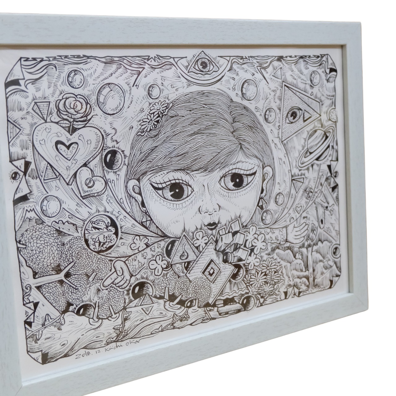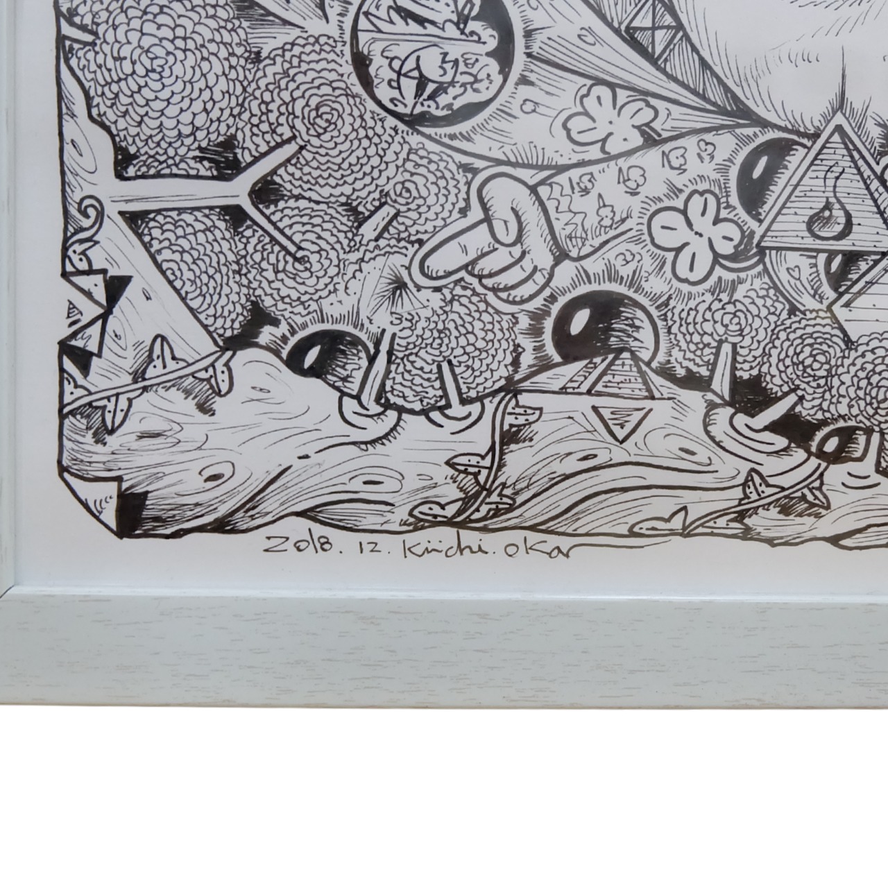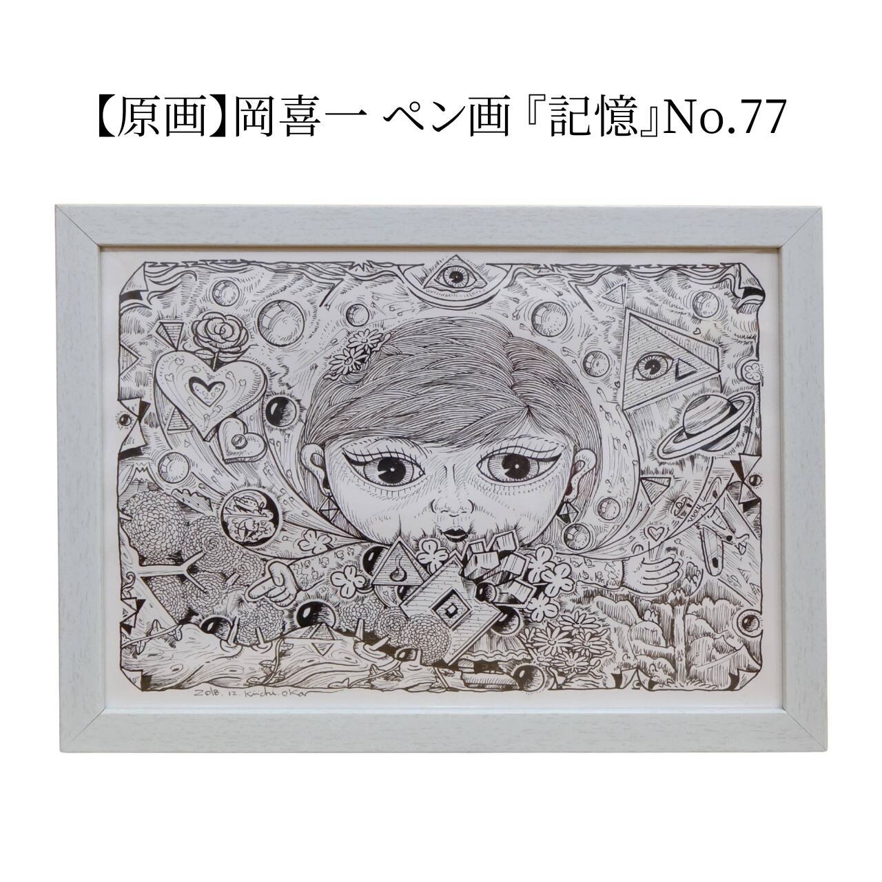 本作は、岡喜一氏が手がける連作「100点ペン画」のうちの一点です。 全ての作品に『記憶』というタイトルが冠されており、作家の脳内に広がる膨大なイメージの断片が、緻密なペンタッチによって一枚ずつ丁寧に描き出されています。 額縁にはシリーズの通し番号が振られた、世界に唯一の貴重なナンバリング作品です。