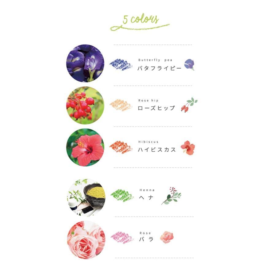 バタフライピー、ヘナ、バラ、ローズヒップ、ハイビスカスの全5色で、少ない本数ながら豊かな色彩を楽しんで頂けます。